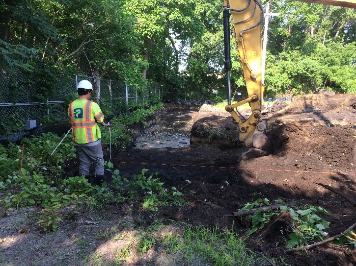 Posillico Environmental, Inc (Posillico), National Grid’s Remediation Contractor began soil excavation for the 2-foot Site cover and also started the construction of the wet meadow area with the gabion stone weir. Excavated soil was stockpiled and covered with plastic sheeting, awaiting transportation to a permitted disposal facility. Soil erosion and sediment control measures were inspected and maintained. Five Community Air Monitoring Program (CAMP) stations were operated during remedy implementation to monitor for the presence of volatile organic compounds (VOCs) and particulates at the Site’s property line.
